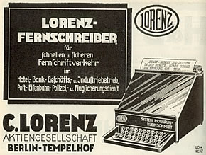 The C.Lorenz AG is one of the pioneers of telegraph and teleprinter equipment producers in Germany. Already, in first days of teleprinting they started producing typeprinting telegraph systems. (e.g. for the Berlin Police department around 1900, see photo right) The production of 5-bit-Baudot teleprinter equipment started in 1929 due to a contract with the Kleinschmidt-Morkrum company, Chicago (later Teletype Corp.). The C.Lorenz AG bought licences and patents and started producing teleprinters that worked in order to the start-stop system. The company's first machines were licences of Teletype model 14 and model 15. The Lo133, built in the 1960s, was the first completely self designed machine. Also in the 1960s they changed name from C.Lorenz AG to SEL (Standard Electric Lorenz AG). In the 1980s bought by ALCATEL. |